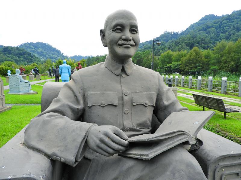 One potential solution is a picturesque park surrounding Chiang Kai-shek’s mausoleum in Taoyuan, incongruously home to hundreds of stone and plaster Chiang Kai-sheks gradually relocated from across the nation. At the popular attraction, tourists amble around a lakeside path, lined with Chiang Kai-shek busts, and stop to examine groups of larger Chiang Kai-sheks, different colors and sizes, but all smiling, positioned so they appear to be chatting with each other.