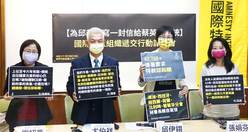 Amnesty International Taiwan secretary-general Chiu E-ling (邱伊翎) said that executives and secretaries-general of the group’s chapters in Australia, Spain, New Zealand, the Netherlands, Belgium and Portugal have written personal letters to Tsai to appeal for Chiou’s pardon.
