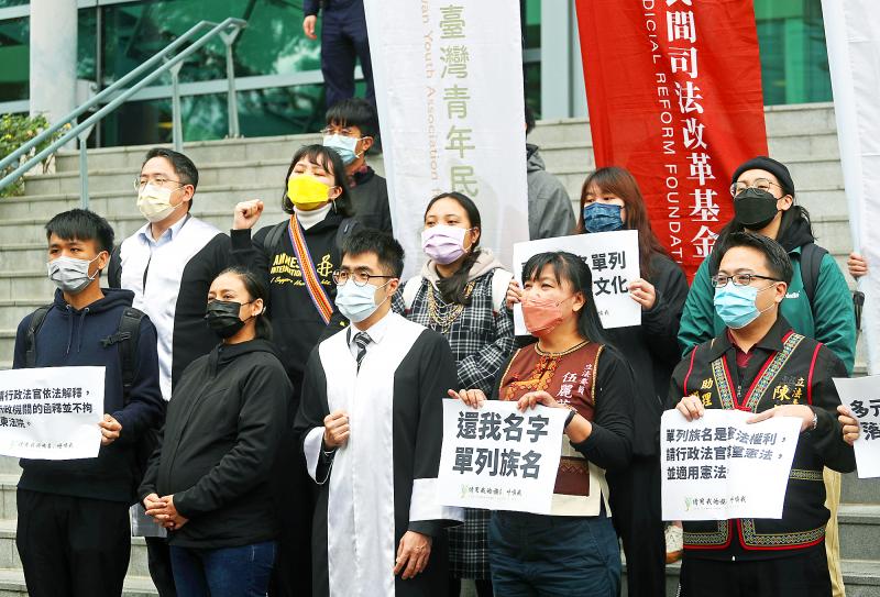 Demcratic Progressive Party Legislator Saidhai Tahovecahe, front second right, and members of the movement “Call me by my real name” hold up placards at a news conference outside the High Administrative Court in Taipei yesterday, demanding that their names be romanized and that Chinese versions of their names be dropped.