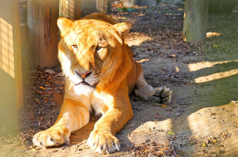 His spine is bent, rendering his left hind leg immobile. Given that the gene regulating body size cannot be passed on by a male lion or a female tiger, his keepers must carefully control his diet to prevent unchecked weight gain.