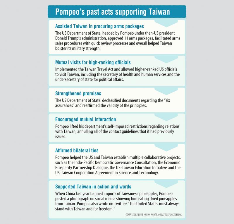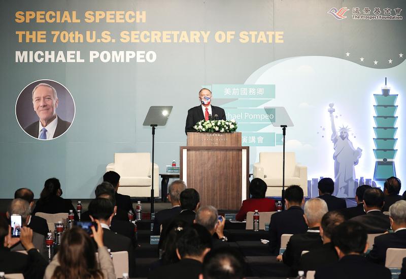 China and Russia are the two biggest threats to democratic countries, and taking over Taiwan would shift the global balance of power in China’s favor, former US secretary of state Mike Pompeo said yesterday in a speech in Taipei.