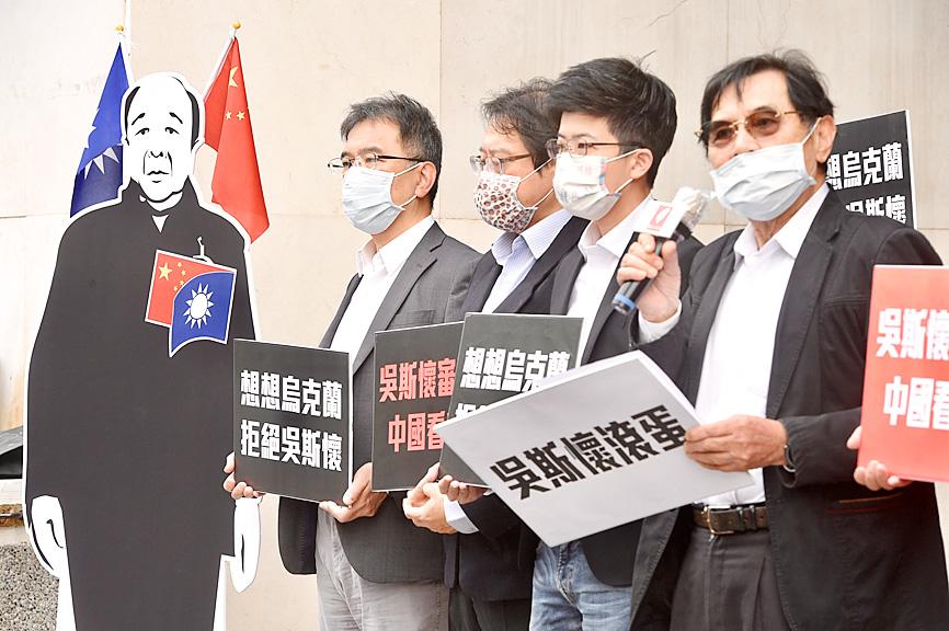 “As a legislator who has a pro-China stance, Wu becoming a member for this committee would lead to irreparable harm to Taiwan,” World United Formosans for Independence chairman Chen Nan-tien (陳南天) said at a protest outside the legislature in Taipei.