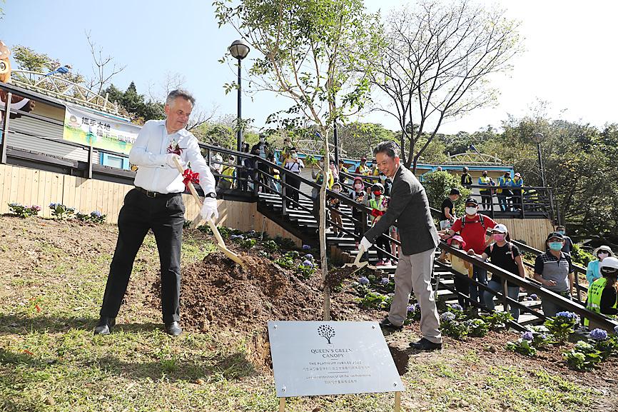British Representative to Taiwan John Dennis yesterday planted a tree in Taipei to mark Queen Elizabeth II’s Platinum Jubilee and Arbor Day, saying that it symbolized Taiwan and the UK’s friendship.