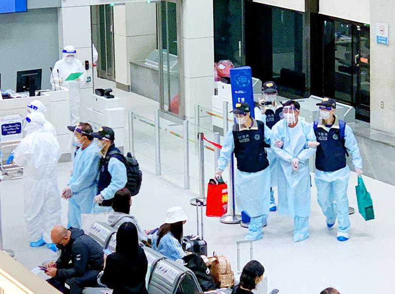 Escorted by a six-member team from the Investigation Bureau, the men, surnamed Hsiao (蕭) and Chen (陳), arrived at Taiwan Taoyuan International Airport at 7:10pm after a transfer flight from Bangkok.