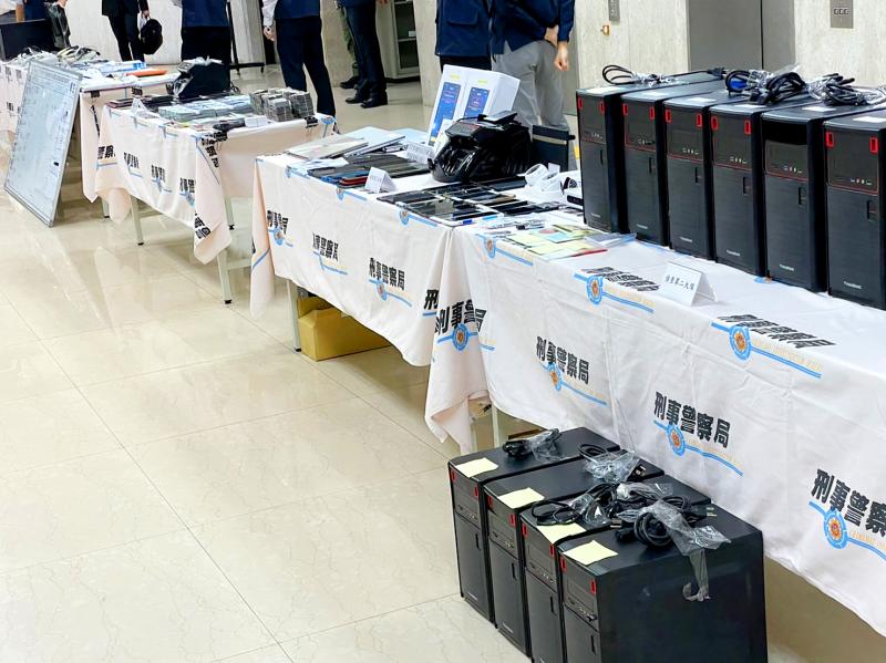 The Kaohsiung Police Department at a news conference on Wednesday presented items and evidence seized in the raid, including 12 computers, more than 100 mobile phones, routers and telecommunications devices.