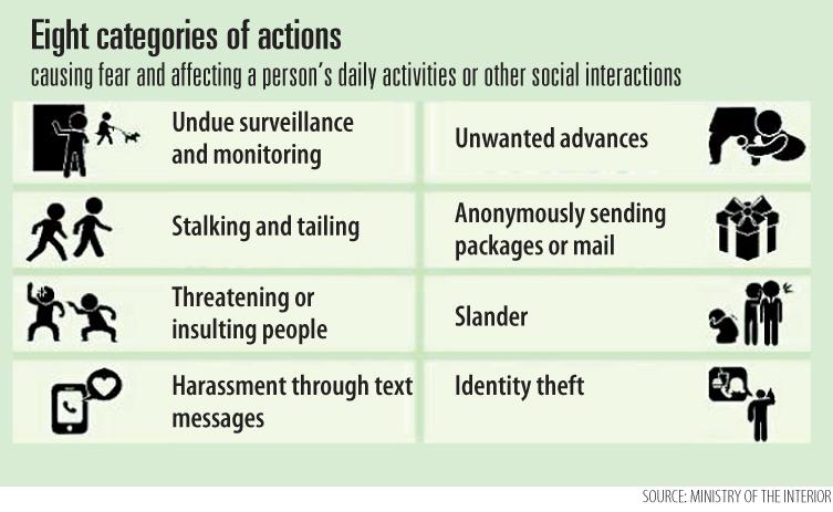 After years of debate, the Legislative Yuan in December last year passed the Stalking and Harassment Prevention Act (跟蹤騷擾防制法), which is to go into effect on June 1.