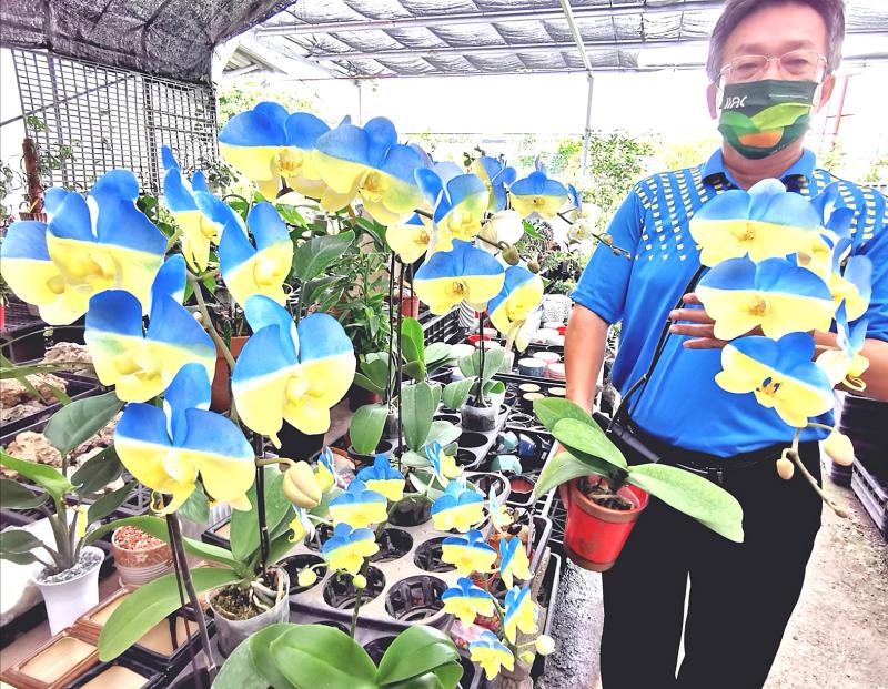 A flower farmer carries blue-and-yellow moth orchids yesterday at a flower market in Tainan’s Gueiren District. The originally snow-white orchids were specially colored for this year’s Taiwan International Orchid Show, using an inkjet dyeing technique, to show solidarity with Ukraine.