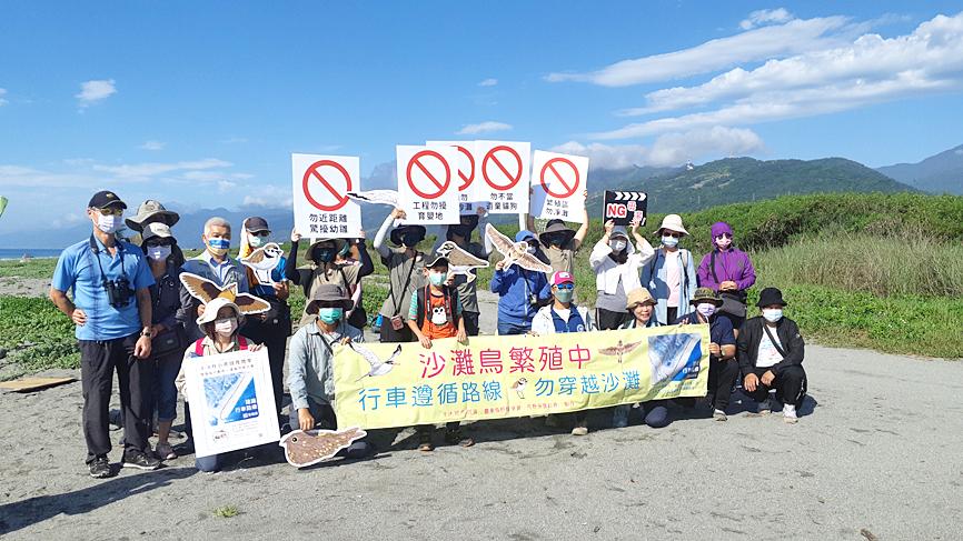 Conservationists yesterday held a demonstration at Taitung County’s Jhihben Beach, calling on the public to avoid activities that disturb breeding seagulls.