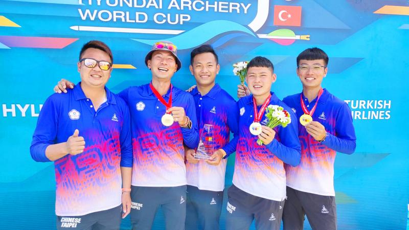 Taiwanese men’s archery team members Wei Chun-heng, second left, Tang Chih-chun, second right, and Su Yu-yang, right, display their medals after winning the final of the men’s recurve event at the Hyundai Archery World Cup in Antalya, Turkey, yesterday. Taiwan defeated Italy 6-0 to take home the gold, while the Netherlands won bronze. The Taiwanese trio hit 10 bullseyes in the final. Taiwanese Olympian Lei Chien-ying led archers Peng Chia-mao and Kuo Tzu-ying to win the recurve women’s team bronze medal on Thursday.