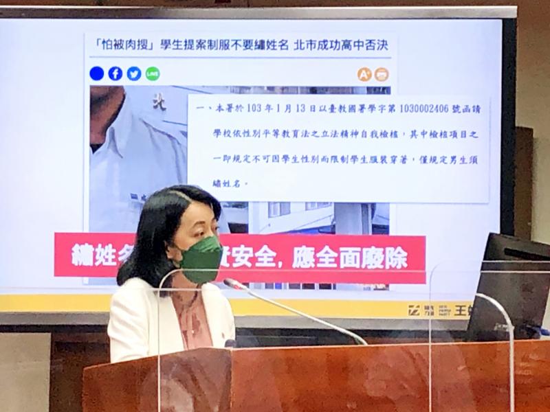Wang first raised the issue during a question-and-answer session at a meeting of the legislature’s Education and Culture Committee in March, saying that a student at Taipei Municipal Chenggong High School was tracked down online because their name was embroidered on their uniform.