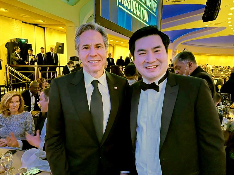 Eric Huang (黃裕鈞), who is also the KMT’s deputy director of international affairs and is stationed in Washington, wrote on Facebook that he took the opportunity of being invited to the association’s annual dinner at the Washington Hilton Hotel to talk with Blinken and US Senator Chris Coons.