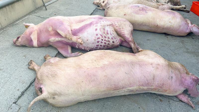 Most of the wounded pigs were not expected to recover and were to be euthanized, farm owner Lin Chia-chih (林家至) said, adding that he estimated the loss to be between NT$5 million and NT$6 million (US$168,322 and US$201,986).