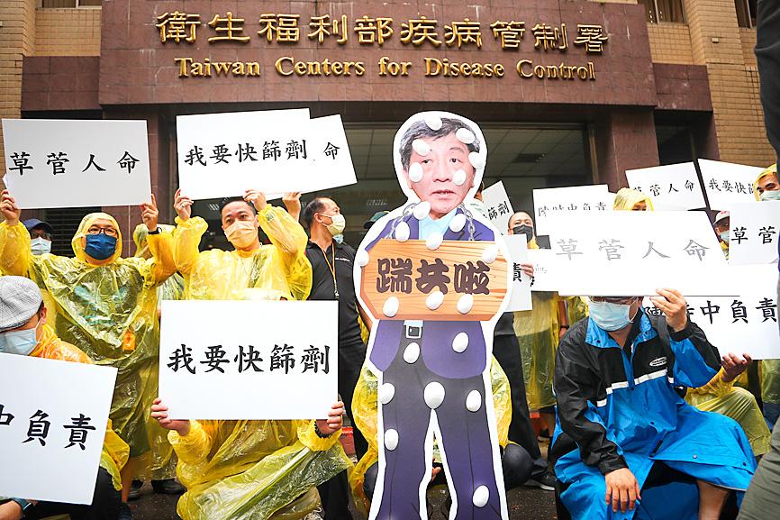 Well Lee (李威爾), a spokesperson for the labor union, tore down a cardboard cut-out of Minister of Health and Welfare Chen Shih-chung (陳時中), who heads the CECC, and said they would consider more drastic measures during their next protest, such as besieging the CECC with their taxis and throwing eggs.