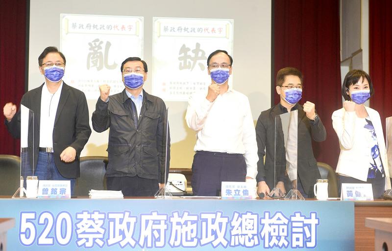 Chinese Nationalist Party (KMT) Chairman Eric Chu, center, and other KMT officials gesture at a news conference held by the National Policy Foundation in Taipei yesterday. The KMT picked “chaos” and “shortage” as the two words that best represent President Tsai Ing-wen’s administration as the sixth anniversary of her presidency on May 20 approaches.