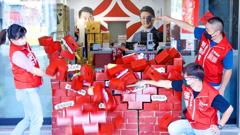 Party executives and candidates at the event built a mock brick wall of cardboard and paper, with “bricks” displaying expensive campaign items such as promotions, television advertising, billboards, banquets, campaign trucks and brochure printing costs.