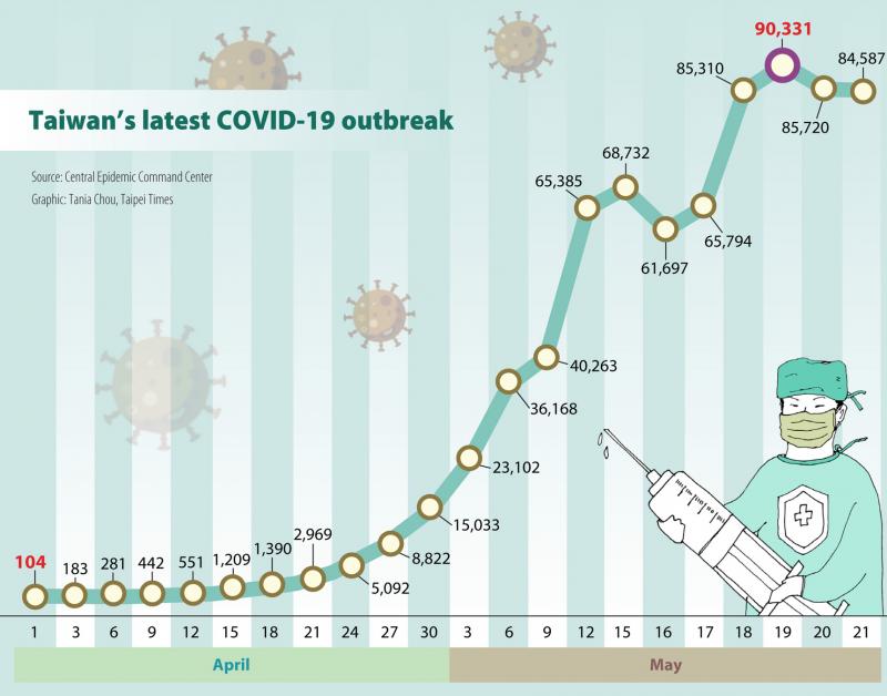 Meanwhile, Centers for Disease Control (CDC) Director-General Chou Jih-haw (周志浩), head of the CECC’s disease surveillance division, said 84,587 new local cases and 52 imported cases were reported yesterday, and 59 deaths were confirmed.