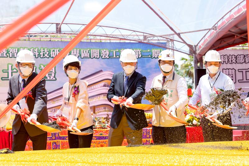 Minister of Science and Technology Wu Cheng-chung, center, Tainan Mayor Huang Wei-che, second right, and other officials yesterday in Tainan attend a groundbreaking ceremony for the second phase of the Cybersecurity and Smart Technology Research and Development Zone, which is expected to be completed next year.