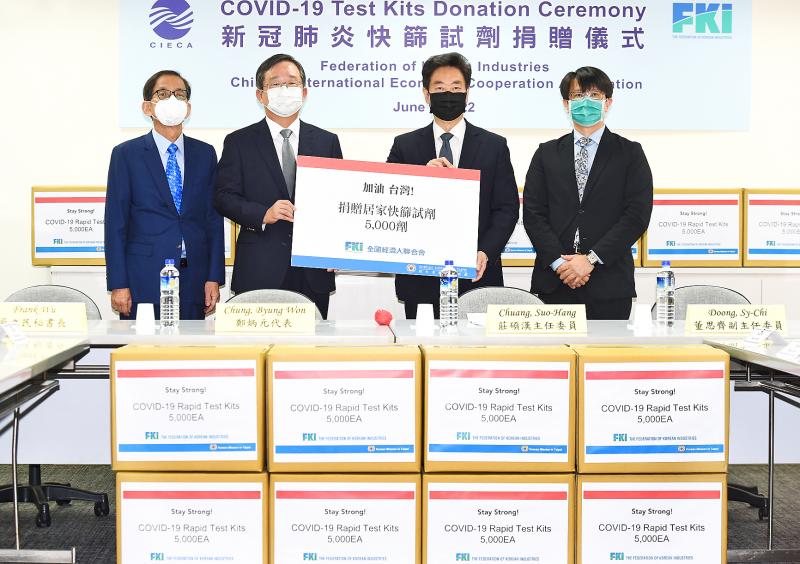 One of South Korea’s most powerful business organizations yesterday donated a batch of 5,000 COVID-19 rapid test kits to Taiwan to help the country combat a serious COVID-19 outbreak.