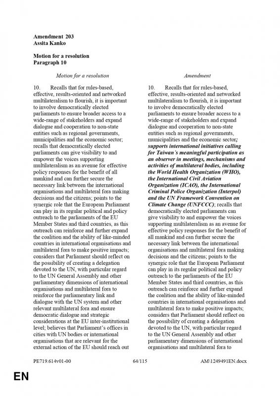 The proposals called for supporting Taiwan’s participation in the WHO, the International Civil Aviation Organization, Interpol and the UN Framework Convention on Climate Change.