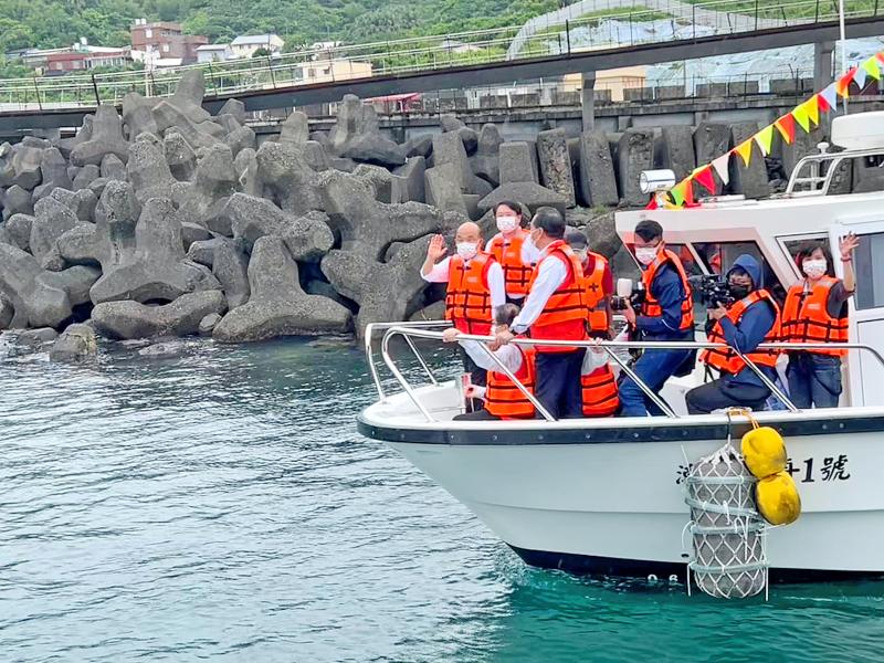 Premier Su Tseng-chang, left, and Keelung Mayor Lin Yu-chang sail on the “Chaojing Ark No. 1” after presiding over its launch ceremony yesterday. Built by the National Museum of Marine Science and Technology, the research vessel features a glass hull.