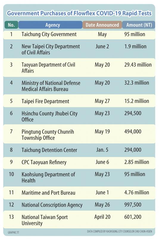 After Safeway OA obtained an EUA for importing Flowflex, it received orders from 13 agencies, including the Ministry of National Defense’s Medical Affairs Bureau, the Zhubei Township Administration Office, the Taichung Department of Health and the Kaohsiung Department of Health, Democratic Progressive Party Legislator Lin Chun-hsien (林俊憲) said.