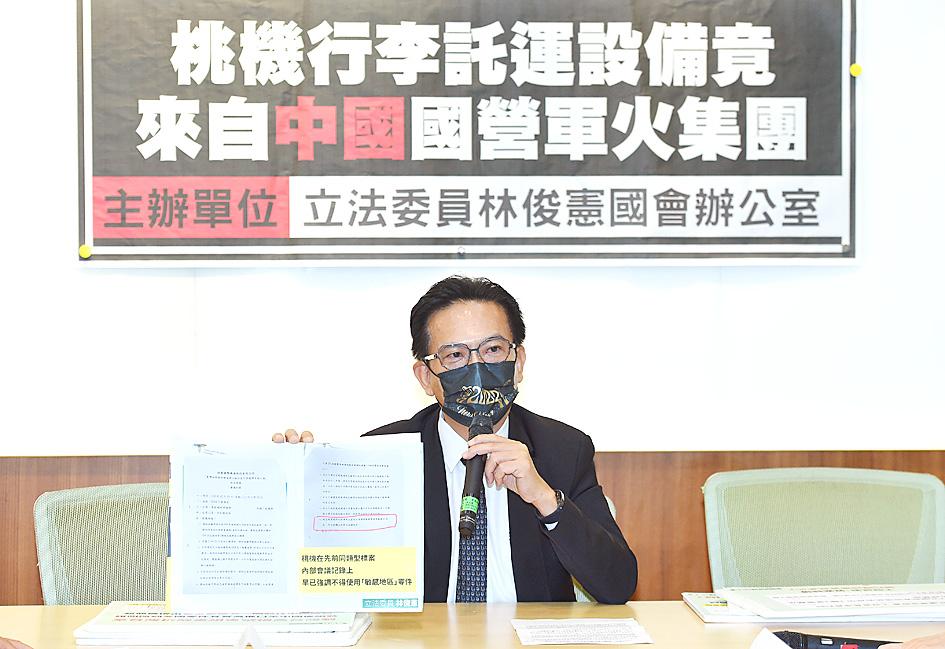The luggage self-check-in system in Taiwan Taoyuan International Airport’s Terminal 1 contains parts and software made by a subsidiary of a Chinese arms manufacturer, which could put the nation at risk, Democratic Progressive Party Legislator Lin Chun-hsien (林俊憲) said yesterday.