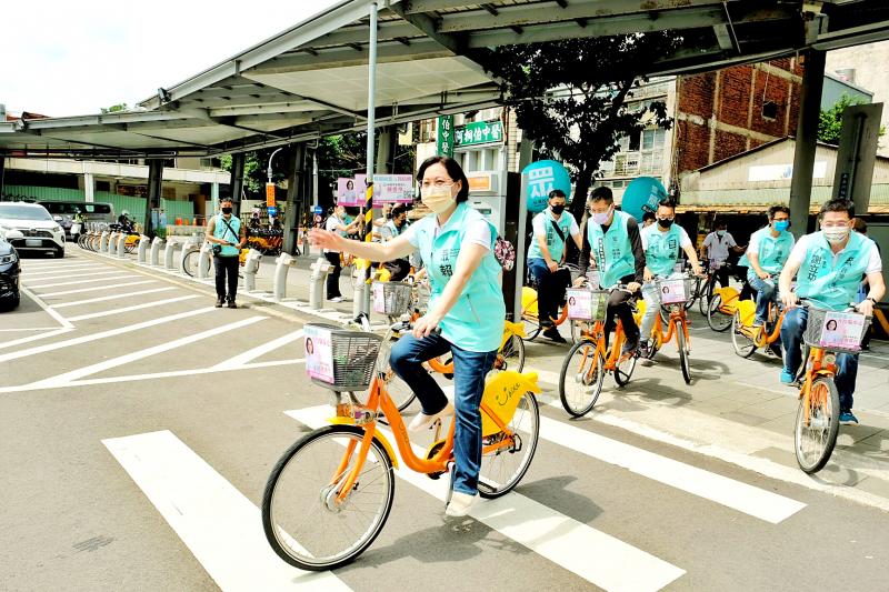 Taiwan People’s Party (TPP) Legislator Lai Hsiang-ling, front, and other TPP members yesterday ride bicycles as they launch her campaign for Taoyuan mayor. The legislators are to ride YouBikes throughout the campaign, in which Lai hopes to bring a “Taipei experience to Taoyuan.”