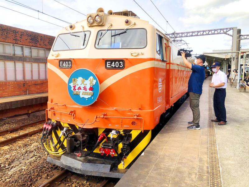 A train enthusiast films the departure of the Taiwan Railways Administration’s (TRA) last-ever Juguang-class train service, Juguang 521, on platform 3 at Keelung’s Cidu Railway Station yesterday. One of the TRA’s slowest train services, the domestically built Juguang-class carriages feature “rotate and push” doors that fold inward and often flummox uninitiated passengers.
