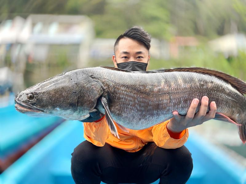 A man holds an invasive giant snakehead fish at Sun Moon Lake in Nantou County in an undated photograph. Local fishers yesterday said that the fish’s breeding season will start later this month, with populations expected to explode in August.