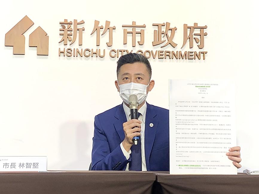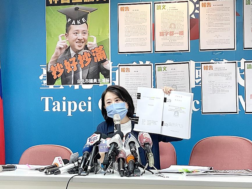 Taipei City Councilor Wang Hung-wei (王鴻薇) said a thesis that Hsinchu Mayor Lin Chih-chien (林智堅) submitted while studying in a master’s program at Chung Hua University drew most of its content from a paper that was released a month earlier.