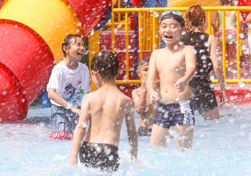 Children play at the Taipei Water Park in Zhongzheng District yesterday. The Central Weather Bureau yesterday issued a high-temperature alerts for Taipei and New Taipei City, as well as Pingtung County, Hualien County, Tainan and Kaohsiung, reminding people to hydrate and put on sunscreen.