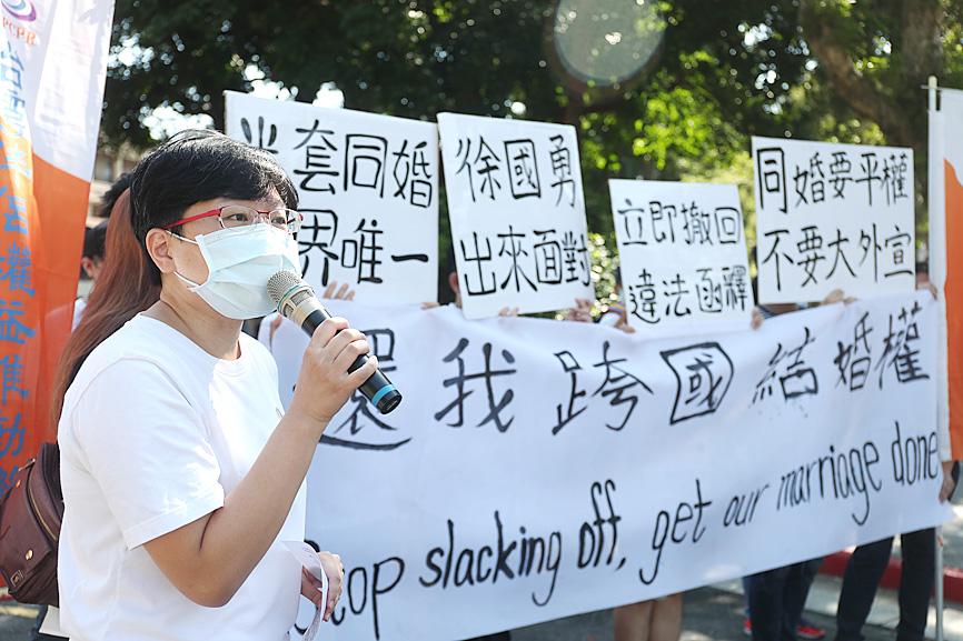 Alliance secretary-general Chien Chih-chieh (簡至潔) said that the continued rejection of certain cross-national same-sex marriages is “illegal.”