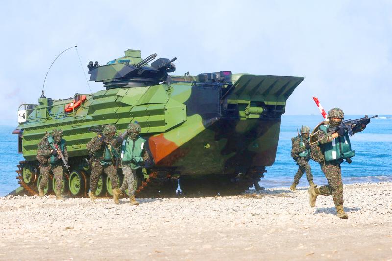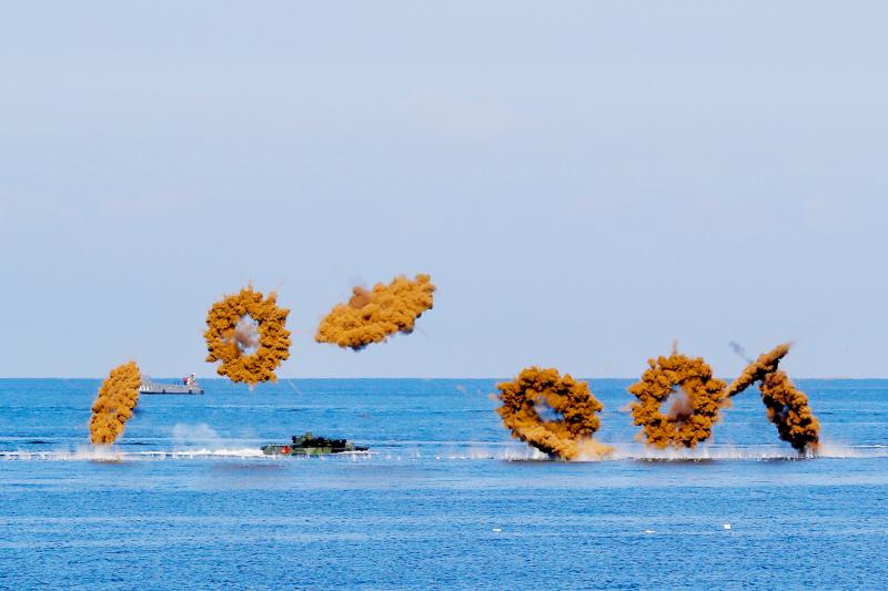 In other Han Kuang drills yesterday, the 99th Marine Brigade held a joint landing operation at a beach in Pingtung County’s Fangshan Township (枋山).
