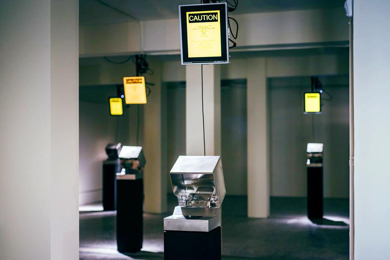 Cheng Hsien-yu’s (鄭先喻) Discharge What You Charged — which consists of cube-like lidded apparatuses on plinths arranged around a display space — is part of “Transistor,” a special exhibition at the Museum of Contemporary Art (MOCA) in Taipei.