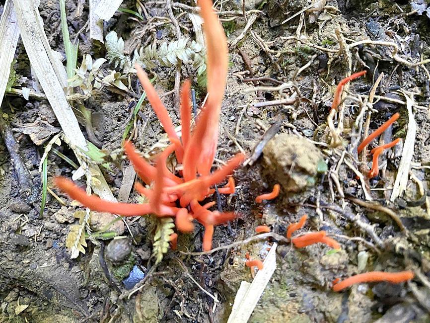 A hiker surnamed Lee (李) on Saturday said that he took a photograph of a cluster of red fungi he saw on his way to Gaoyaoshan (高腰山) in New Taipei City’s Wulai District (烏來) last month.