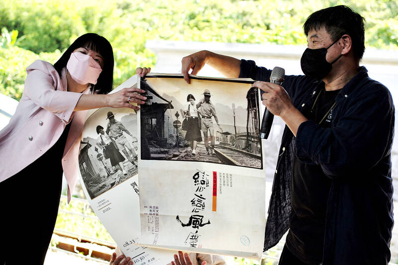 Taiwanese documentary photographer Liu Chen-hsiang, right, poses with curator Hsieh Pei-ni during his latest exhibition “Dust in the Wind,” featuring still photographs taken on the set of Hou Hsiao-hsien’s 1986 film of the same title, at the Ho Base in Rueifang District, New Taipei City, yesterday. The exhibition runs until Oct. 30.
