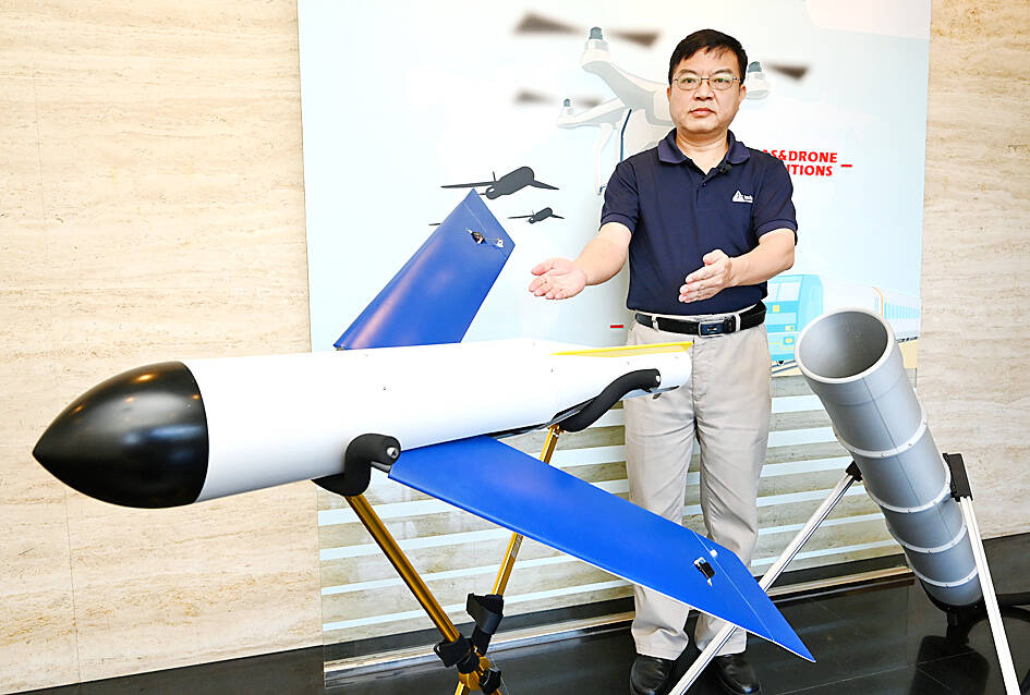 JC Tech president Robert Cheng (鄭志誠) said his company has built and tested prototypes of a suicide drone, named the Flyingfish, that was inspired by the US-made Switchblade drones used in Ukraine.