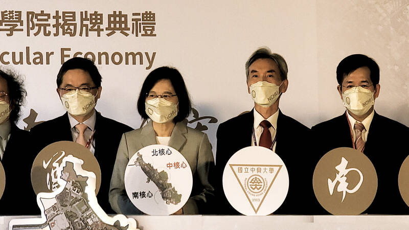 Government partnerships with academia and enterprises are key to achieving net zero emissions by 2050, President Tsai Ing-wen (蔡英文) said yesterday at the founding of the nation’s first academy dedicated to the circular economy.