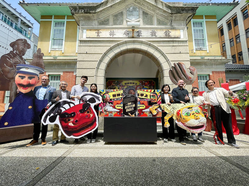 Yunlin County Commissioner Chang Li-shan, fourth right, Northwest Puppet Center director Dmitri Carter, third right, and others attend a ceremony at the Yunlin Palm Puppets Museum in the Huwei Township yesterday, the first day of an exhibition displaying collections from the center. The exhibition is to run until March 12 next year.