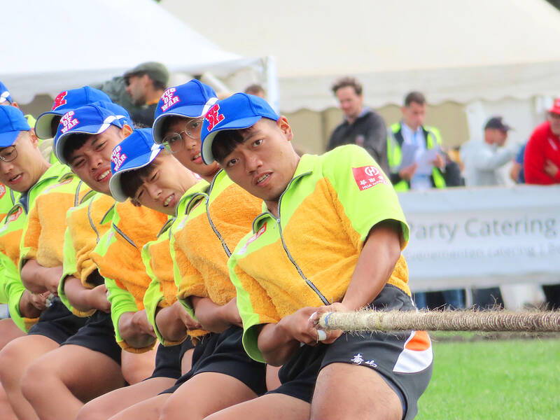 A team from Taiwan competes in the club competition of the World Indoor Tug of War Championships in Holten, Netherlands, on Thursday. Taiwanese teams won four silver medals on the first day of the club competition on Wednesday in the mixed 580kg, junior men’s 560kg, women’s 500kg and under-23 mixed 560kg categories, considered a warm-up before this weekend’s world championship.