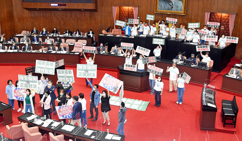 KMT caucus whip William Tseng (曾銘宗) and others stood in the middle of the hall holding signs and shouting slogans saying that the government’s processing of vaccine compensation claims was slow and that there were “shady deals” behind the procurement of vaccines.