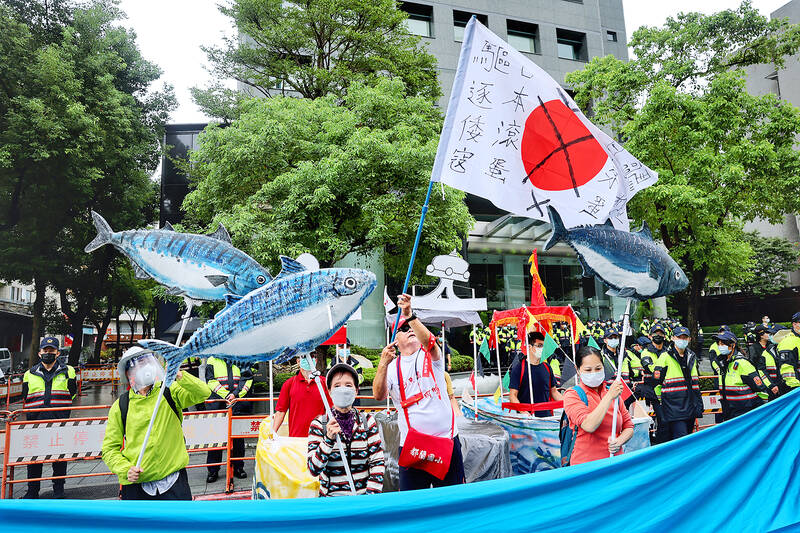 Members of the Diaoyutai Education Association, Yilan County Fishermen’s Rights Association and other groups protest in front of the Japan-Taiwan Exchange Association’s office in Taipei yesterday. The protesters urged the Japanese government to stop what they called the harassment of Taiwanese fishing boats near the Diaoyutai Islands, which are controlled by Japan, but are also claimed by Taiwan and China.