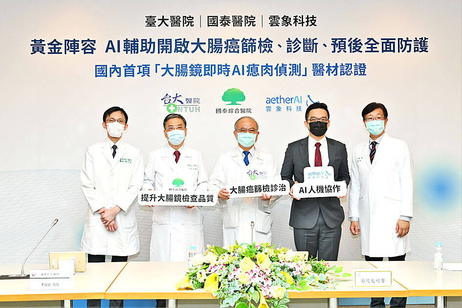 National Taiwan University Hospital (NTUH), Cathay General Hospital and aetherAI yesterday announced an artificial intelligence (AI) system to help detect polyps and tumors during colonoscopies, with 96 percent accuracy.