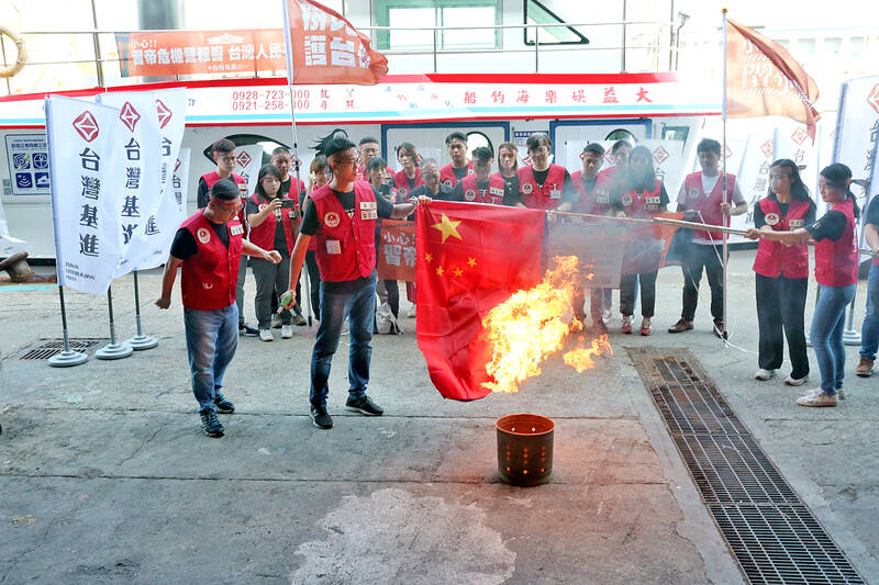 Two small Taiwanese groups at the far ends of the debate over relations with Beijing marked the National Day of the People’s Republic of China yesterday with flag raisings and flag burnings — opposite responses at a time of rising tension over the Taiwan Strait.