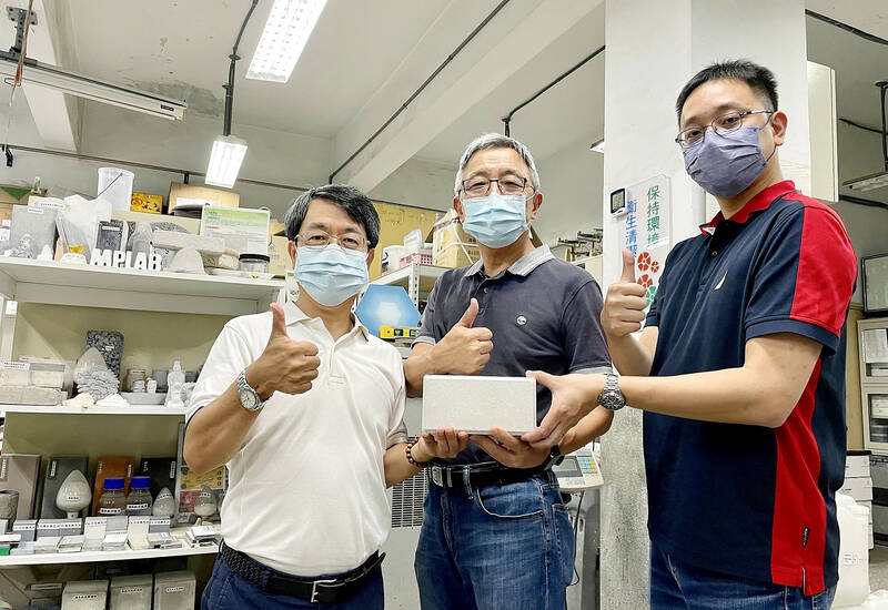 The brick was an innovation of Shao Wen-cheng (邵文政), a lecturer in the university’s Innovative Green Building Materials Research and Promotion Center, and Cheng Ta-wui (鄭大偉) and Lee Wei-hao (李韋皞), who teach in the Institute of Mineral Resources Engineering, the university said in a news release on Friday.