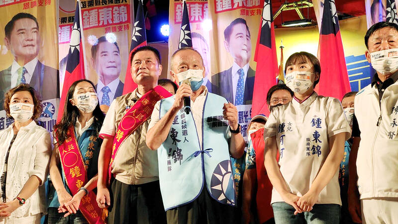 Chung is backed by incumbent KMT Miaoli County Commissioner Hsu Yao-chang (徐耀昌), who made several appearances at campaign events to rally support.