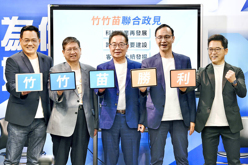 Chinese Nationalist Party (KMT) candidates for Hsinchu City mayor and Hsinchu and Miaoli county commissioners yesterday held a joint news conference in Taipei to present their policy platforms on cross-region infrastructure, industrial and medical sector development, and Hakka culture promotion.