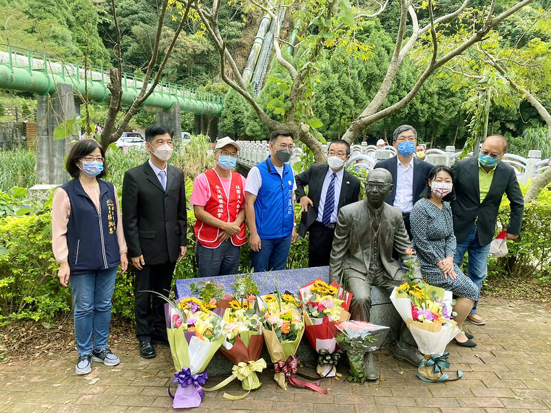 Hakka Affairs Council Minister Yiong Con-ziin, back, second right, Chinese Nationalist Party (KMT) Legislator Chiang Chi-chen, back, fourth right, and others yesterday pose for a photograph with a statue of Japanese engineer Norio Isoda at Taichung’s Baileng Canal. The canal, which was built by Isoda between 1928 and 1932, is marking its 90th anniversary.