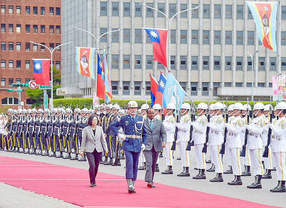 President Tsai Ing-wen (蔡英文) is to welcome King Mswati III with a military salute and host a state banquet, and the king and his delegation are to meet with Minister of Foreign Affairs Joseph Wu (吳釗燮), the ministry said in a statement.