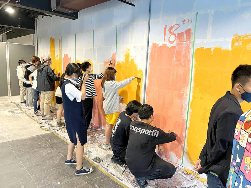 Twenty high-school and college students yesterday painted a wall in Taipei pink and orange to represent the passion of youth, and show the public that young people are ready to fight for their future and take on the responsibility of voting at 18.